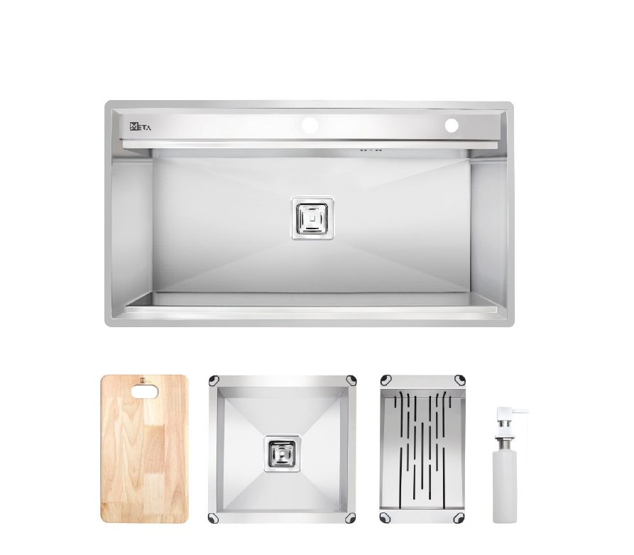 سینک استیل متا مدل M90 S پله دار جزو سینک های توکار و لوکس محسوب می شود که بدنه آن از جنس ورق استیل استلنس ۳۰۴ مرغوب با ضخامت ورق ۱.۲ میلی متر و خاصیت ضد زنگ، مقاومت بالا نسبت به خط و خش، گرما، رشد باکتری و کاملا آب بندی شده می باشد.